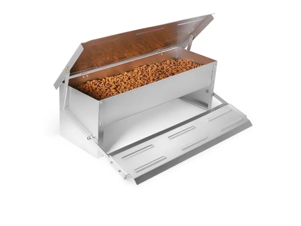 Az etető ajtóval van felszerelve, amely automatikusan kinyílik, amint a tyúk rálép. Így a takarmány kizárólag az Ön tyúkjai számára elérhető, és védve marad a külső hatásoktól.