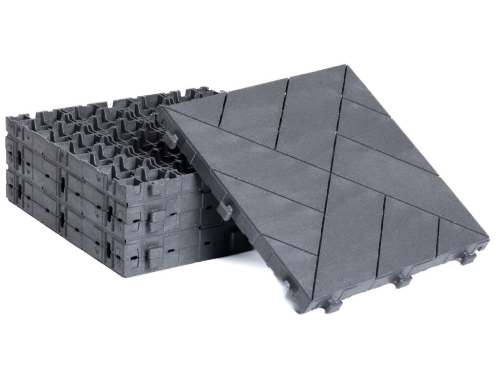 Gumilap 30 x 30 cm, 1,5 cm magasságban, szürke színben. Gumi és polipropilén keveréke (100% újrahasznosított anyagok), hosszú élettartammal és nagy ellenálló képességgel. Nagyon egyszerű telepítés.