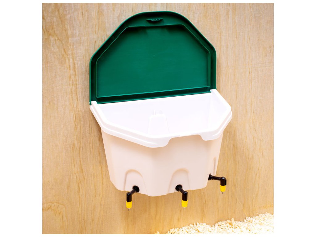Speciális forma: az AviAqua lehetővé teszi, hogy 3 tyúk egyszerre igyon. AviAqua előre döntött fedéllel rendelkezik, amely megakadályozza a baromfi ráülését. Az itató színe minimálisra csökkenti a fény bejutását a vízbe, így gátolja az algák növekedését.