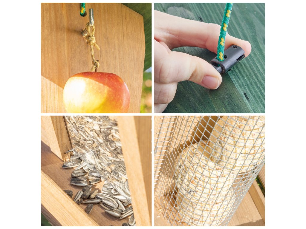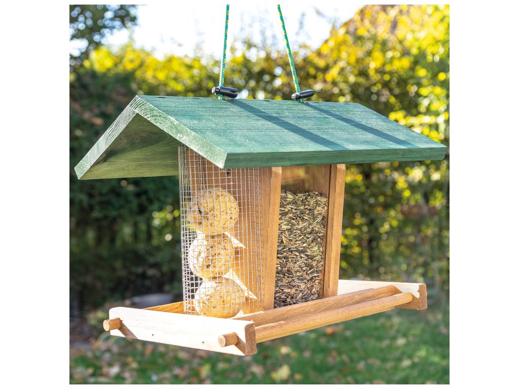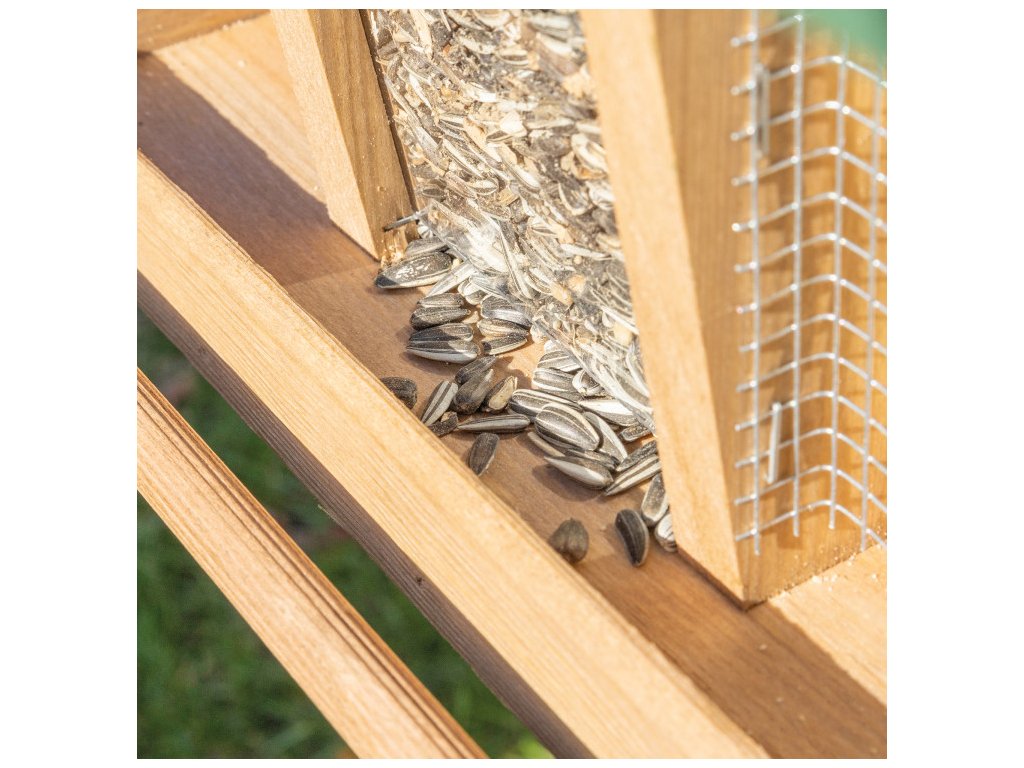A masszív plexiüvegnek köszönhetően jól látható, mikor szükséges az etetőt újratölteni. A takarmány így ideálisan védett a nedvességtől. A kis látogatók, például verebek, vörösbegyek és más madarak, kényelmesen leülhetnek a két oldalsó ülőrúdra, és kényelmesen csipegethetik a magvakat a silóból.