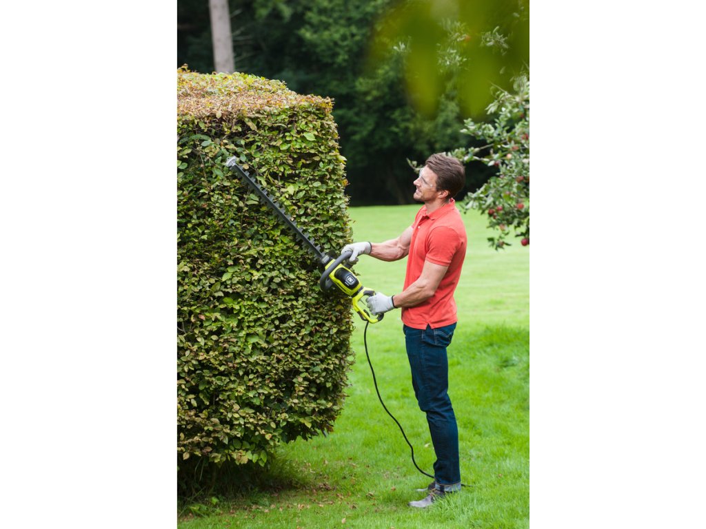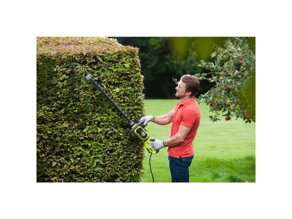 Elektromos sövényvágó RYOBI RHT6160RS, 600 W teljesítménnyel, forgatható fogantyúval, ideális segítőtárs a sövények, díszfák és bokrok ápolásához, amely segít megőrizni sövényét szép és egészséges állapotban.