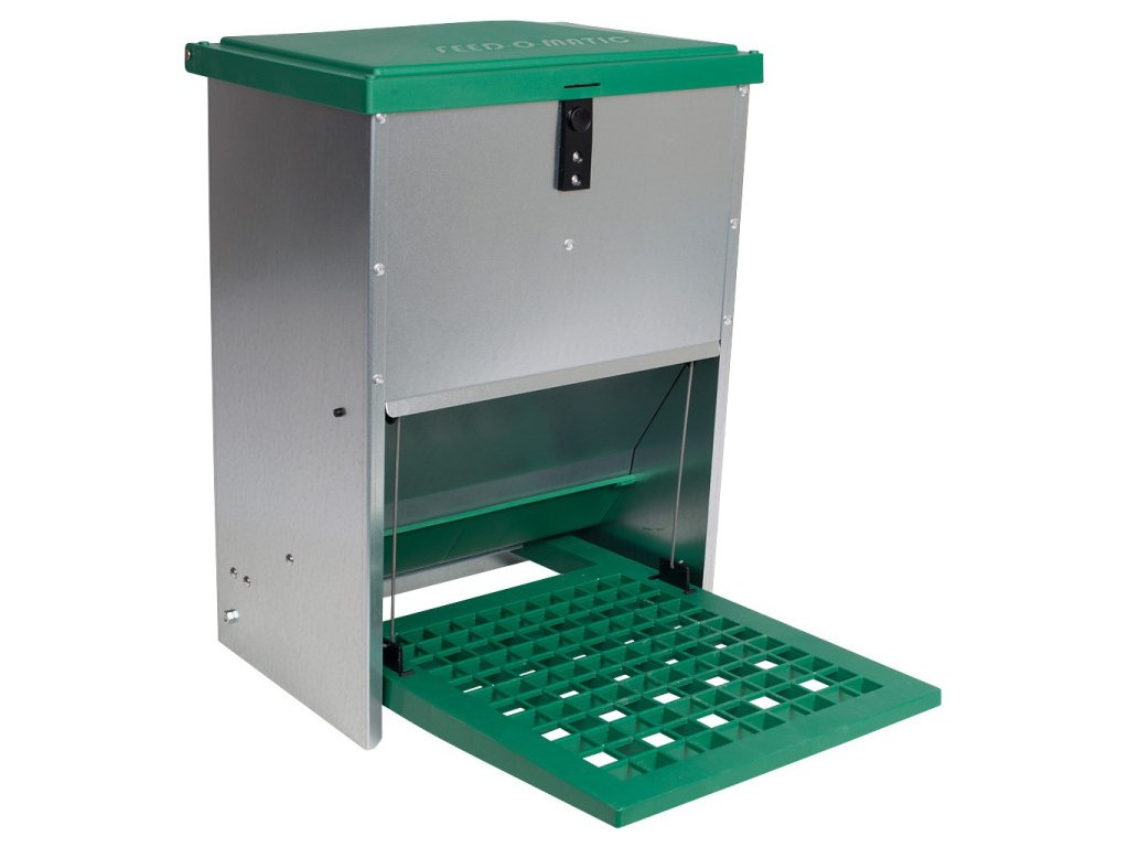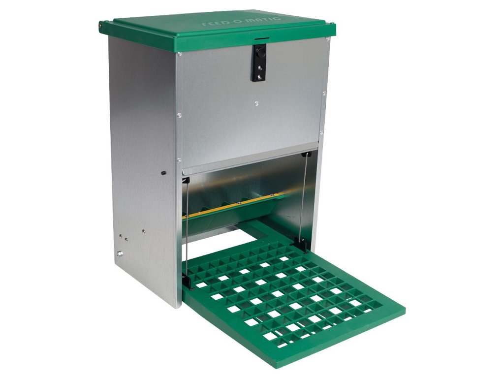 A Feed-o-matic megvédi a baromfit a veszélyes betegségektől. A taposó etető stabil, könnyen tisztítható és fröccsenő víz ellen védett.