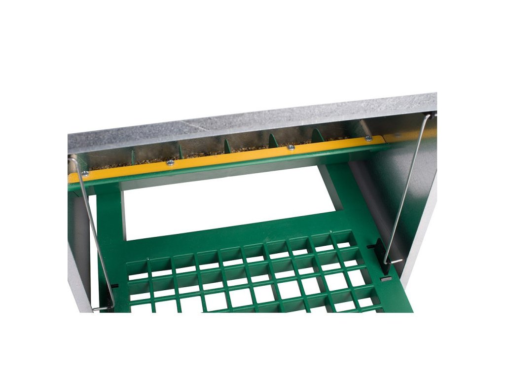 Az etető elválasztókkal és túlfolyó peremmel van ellátva, amelyek jelentősen csökkentik a takarmányveszteséget. További előny: a műanyag használatának köszönhetően az etető sokkal halkabb, mint a versenytársai. A fém és műanyag érintkezése kevesebb zajt kelt, mint a fém a fémen.