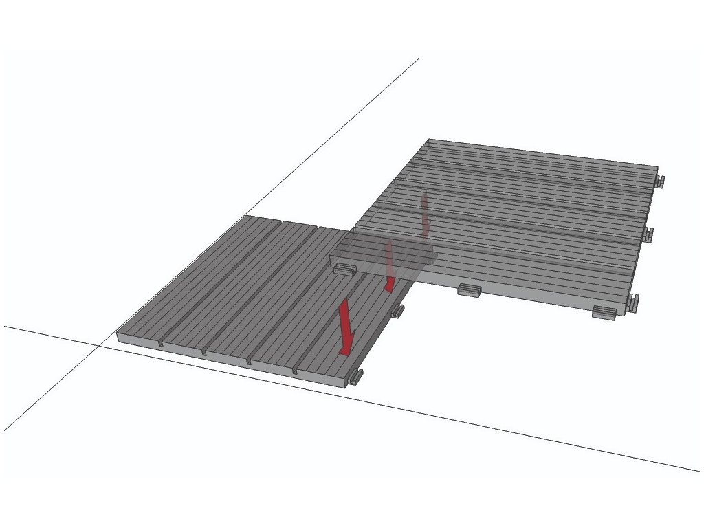 A padlót néhány óra vagy egy délután alatt lefektetheti – ez attól függ, hogy mekkora területet fog lerakni. A csempe praktikus hornyokkal rendelkezik, amelyek a felesleges víz elvezetésére szolgálnak. Ennek köszönhetően a víz nem gyűlik össze a csempe és az aljzat között, és nem képződik penész. A csempe aljáról sík felületek nem károsítják a terasz vízszigetelését. A szigetelés és a csempe közé nem kell másik szövetet behelyezni. A csempe rögzítése oldalsó összekötő horgokkal, ún a Quick-Click rendszer segítségével.