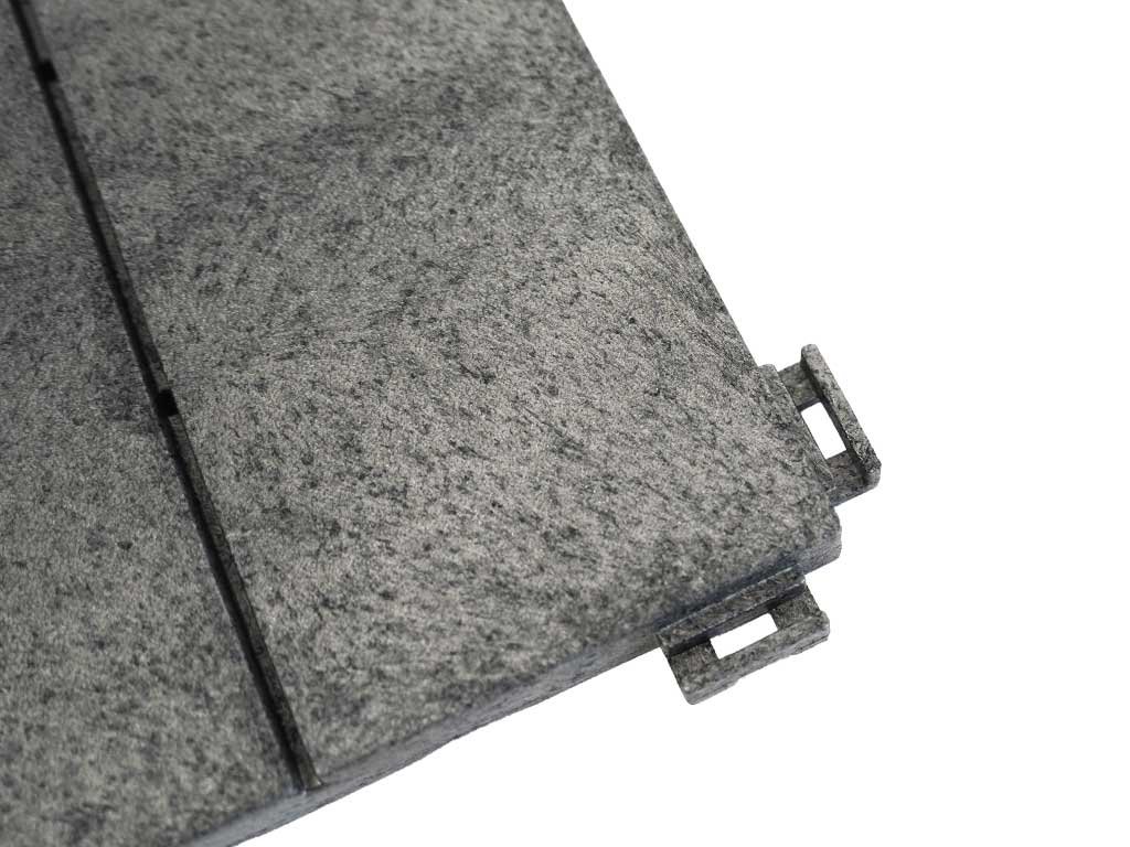 100%-ban újrahasznosított gumiból és műanyagból készült (TÜV Nord certifikáció). Az 1,4 cm vastag lapok évekig ellenállnak az időjárás viszontagságainak. A burkolólapokat függőlegesen vagy vízszintesen is kombinálhatja, és könnyen letörölheti róluk a szennyeződéseket.