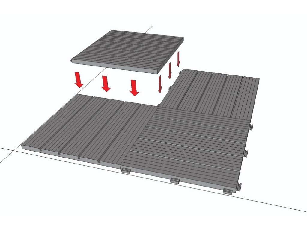 A padlót néhány óra alat vagy egy délután lefektetheti - ez attól függ, hogy mekkora a hely, ahol a lapokat elhelyezi. A csempék praktikus hornyokkal rendelkeznek, amelyek a felesleges víz elvezetésére szolgálnak. Ennek köszönhetően a víz nem gyűlik össze a csempe között, és az aljzat és a penész nem képződik. A csempe aljáról származó lapos ülőfelületek nem károsítják a terasz vízszigetelését. Nem kell további szövetet behelyezni a szigetelés és a csempe közé. A csempék oldalsó összekötő horgokkal, az úgynevezett Quick - Click rendszerrel rögzítik.