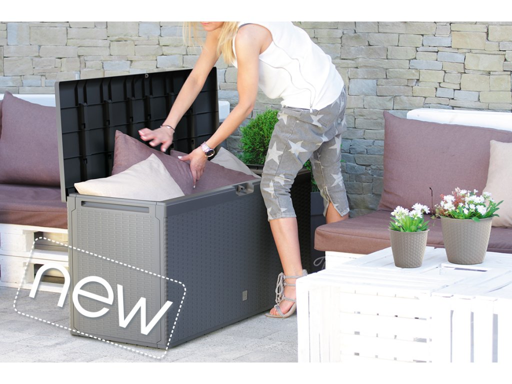 A doboz könnyű, szellőztetett és megvédi a tárolt tárgyakat az esetleges esőtől. Könnyen tárolható kerti bútorok, párnák, takarók, kerti kellékek, kisebb bútorok vagy gyermekjátékok. Lakattal is rögzíthető, és értékesebb dolgokat zárhat be.