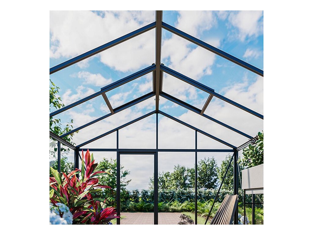 Alap üvegház tvoří lehká, de szilárd és propracovaná szerkezet z hliníkových profilok, amely vannak přirozeně ellenálló vůči korozi, dlouhodobě nenáročné na údržbu és dobře snášejí běžné venkovní podmínky. Alumínium zároveň umožňuje přesné lícování dílů, volbu různých typů zasklení és přizpůsobení szerkezet is vzhledu podle individuálních potřeb. Výsledkem van stabil és prvotřídní provedení, doložené 12letou zárukou na alumínium keret, použitím systémových extrudovaných profilok és integrovaným okapovým systémem, amely zvyšuje tuhost celé szerkezet.