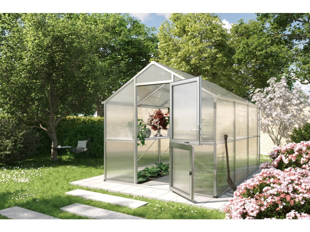 Polikarbonátový üvegház KGT Iris van více než jen üvegház – van to az Ön kreativní prostor számára termesztés és péči o rostliny, kde tudja naplno realizovat svou vášeň számára zahradničení. Alumínium szerkezet üvegház Iris zaujme svou stabilitou és odolností. Nélkül rušivých konzol és plastových lišt vyzařuje jednoduchou eleganci. Ez üvegház byl vytvořen így, aby Önnek dělal společnost után celý rok v minden fázi termesztés.