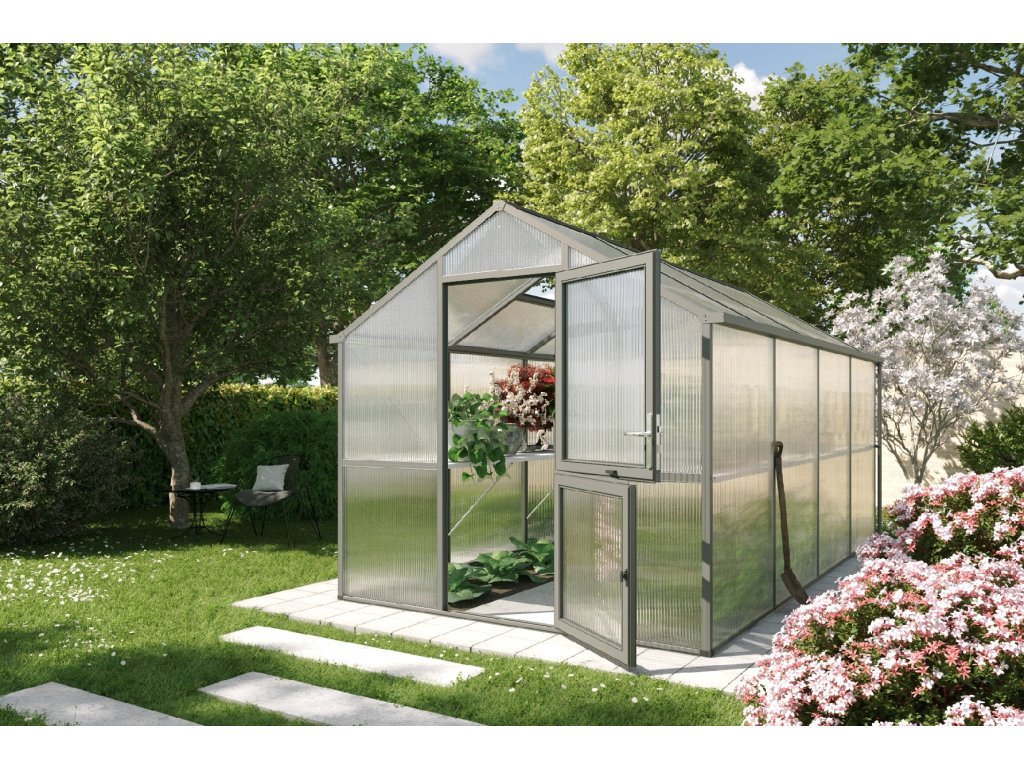 Üvegház Iris van elérhető ve třech barevných variantách: přírodní alumínium, jedlově zelená (RAL 6009) és antracitově šedá (DB 703). Köszönhetően tomu si tudja vybrat design, amely nejlépe zapadne do az Ön zahrady.