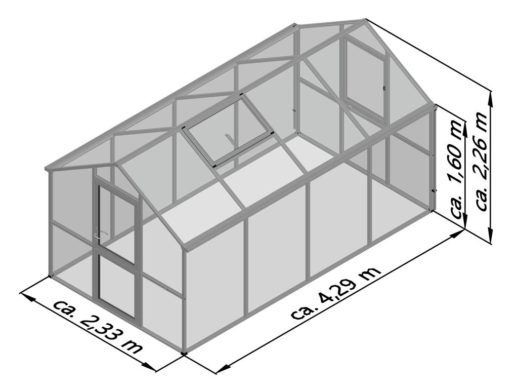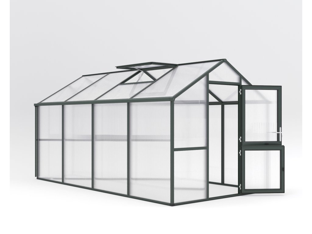 Pohodlná magasság falak 1,60 m megkönnyíti stání és práci ve vzpřímené poloze. To znamená, hogy rajčata és okurky mohou nélkül problémů növekedés do výšky és plně rozvíjet. Masszív alumínium szerkezet spolu s 16 mm kamrásmi deskami ISO biztosítják optimální stabilitu. Praktické okapy s odtoky mindkét oldalon umožní svod dešťové vody do sudu.