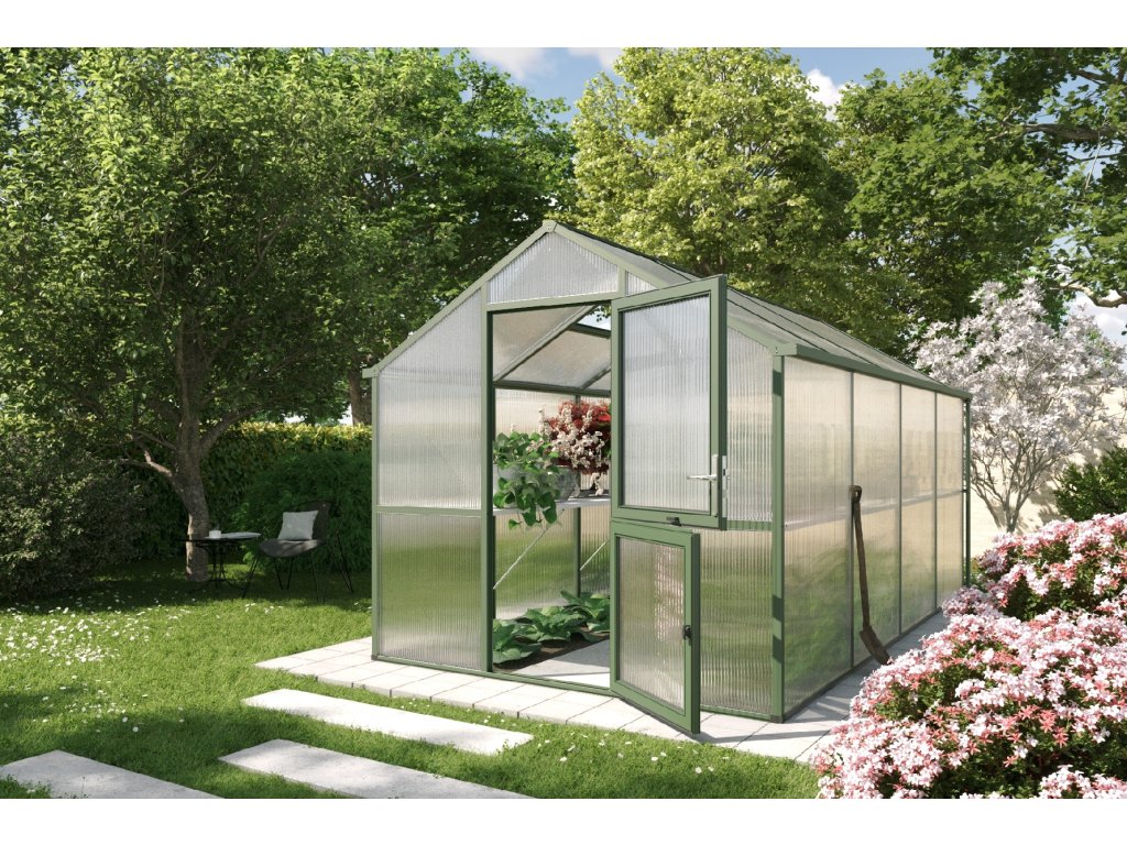Polikarbonátový üvegház KGT Iris van více než jen üvegház – van to az Ön kreativní prostor számára termesztés és péči o rostliny, kde tudja naplno realizovat svou vášeň számára zahradničení. Alumínium szerkezet üvegház Iris zaujme svou stabilitou és odolností. Nélkül rušivých konzol és plastových lišt vyzařuje jednoduchou eleganci. Ez üvegház byl vytvořen így, aby Önnek dělal společnost után celý rok v minden fázi termesztés.