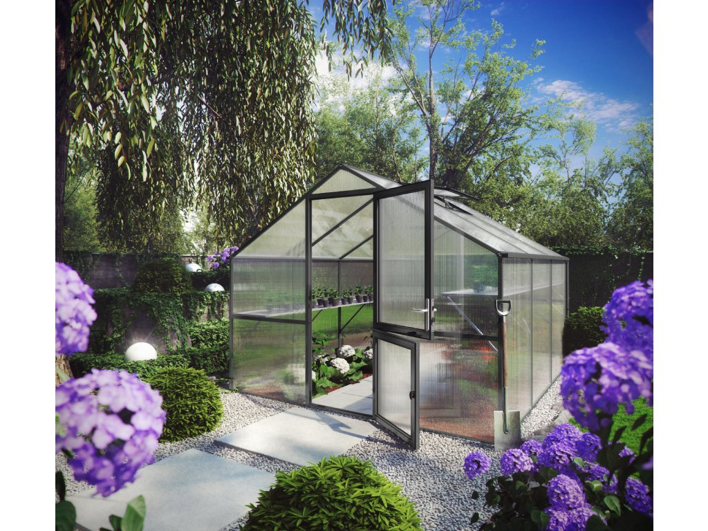 Polikarbonátový üvegház KGT Orchidee v színben antracit byl kifejezetten vyvinut számára náročné hobby kertiky. Průhledné dvojité falak ISO o 10 mm vastagságú vannak után celém obvodu szilárdan uchyceny és zcela uzavřeny v profilech, takže desky nemohou uvolnit ani során nepřízni počasí. Nepoužívají žádné sponky ani drobné příchytky, ami výrazně növeli stabilitu zaüvegház. Dvojité desky továbbá nepropouštějí UV záření – rostliny vannak chráněny előtt spálením és stínění obvykle není nutné. Vysoká szigetelő hodnota panelů pomáhá udržet ve üvegház hő után delší dobu.