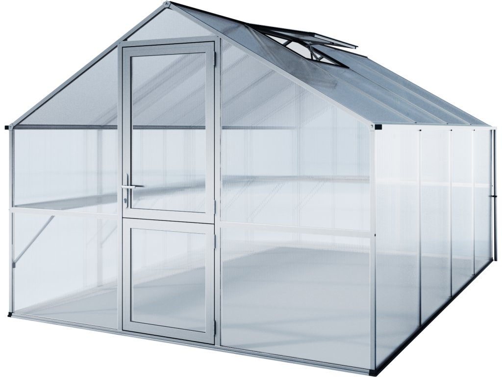 S výškou falak 1,49 m és velkorysou výškou gerinc 2,15 m van zde dostatek prostoru számára práci is számára nagyobb kultury – rajčata és okurky mohou nélkül potíží növekedés vzhůru és plně rozvíjet. Üvegház van vybaven širokými dělenými otočnými ajtókkal és oknem v hátsó falhoz s kézi otevíráním. O automatickou cirkulaci vzduchu stará tetőablak s automatickým otvíračem. Számára zanélkülpečení van standardně dodávána uzamykatelná sada pákových klik Hoppe és jedinečný vzhled ajtó podtrhují hladce fungující belső panty. Mindkét oldalon vannak okapy s odpadními trubkami (hossz 1,40 m) számára svod dešťové vody.