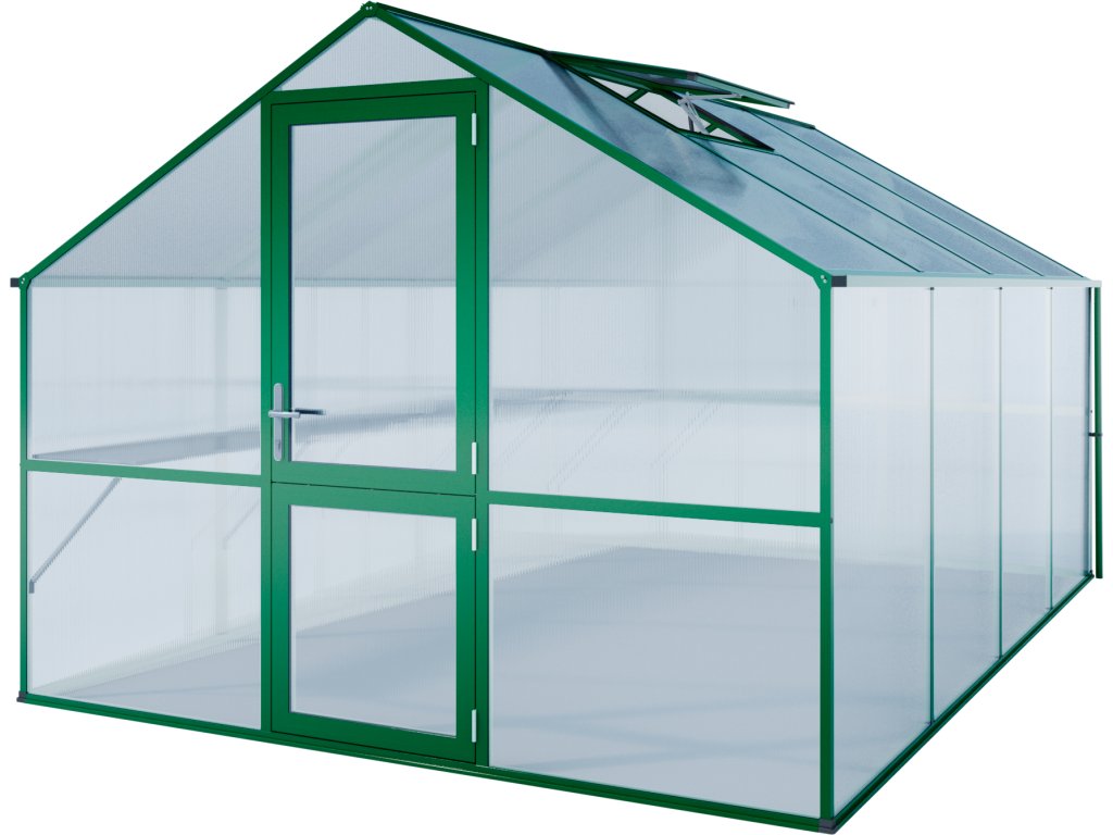 S výškou falak 1,49 m és velkorysou výškou gerinc 2,15 m van zde dostatek prostoru számára práci is számára nagyobb kultury – rajčata és okurky mohou nélkül potíží növekedés vzhůru és plně rozvíjet. Üvegház van vybaven širokými dělenými otočnými ajtókkal és oknem v hátsó falhoz s kézi otevíráním. O automatickou cirkulaci vzduchu stará tetőablak s automatickým otvíračem. Számára zanélkülpečení van standardně dodávána uzamykatelná sada pákových klik Hoppe és jedinečný vzhled ajtó podtrhují hladce fungující belső panty. Mindkét oldalon vannak okapy s odpadními trubkami (hossz 1,40 m) számára svod dešťové vody.