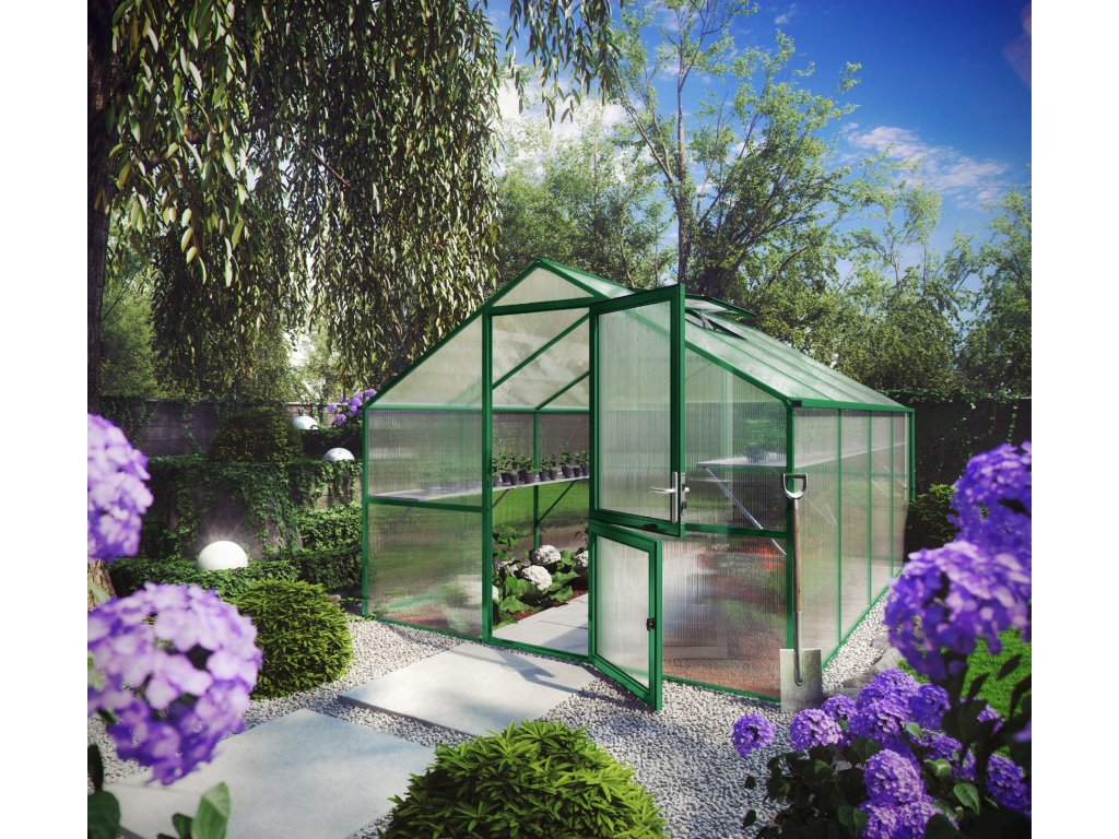 Polikarbonátový üvegház KGT Orchidee v zelené színben byl kifejezetten vyvinut számára náročné hobby kertiky. Průhledné dvojité falak ISO o 10 mm vastagságú vannak után celém obvodu szilárdan uchyceny és zcela uzavřeny v profilech, takže desky nemohou uvolnit ani során nepřízni počasí. Nepoužívají žádné sponky ani drobné příchytky, ami výrazně növeli stabilitu zaüvegház. Dvojité desky továbbá nepropouštějí UV záření – rostliny vannak chráněny előtt spálením és stínění obvykle není nutné. Vysoká szigetelő hodnota panelů pomáhá udržet ve üvegház hő után delší dobu.