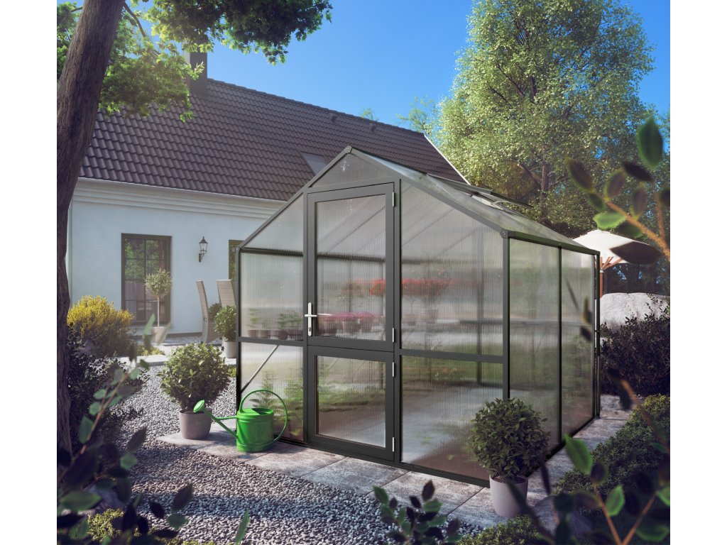 Alumínium üvegház KGT Rose II antracit byl kifejezetten vyvinut számára náročné hobby kertiky. Průhledné dvojité falak ISO o 10 mm vastagságú vannak után celém obvodu zcela uzavřeny v profilech, takže desky ani során nepřízni počasí nemohou uvolnit. K rögzítés nejsou použity žádné sponky ani drobné příchytky – zaüvegház výrazně növeli stabilitu celé szerkezet. Dvojité falak nepropouštějí UV záření, és proto stínění obvykle není nutné; ugyanakkor mají vysokou szigetelő hodnotu, takže hő udrží ve üvegház déle.