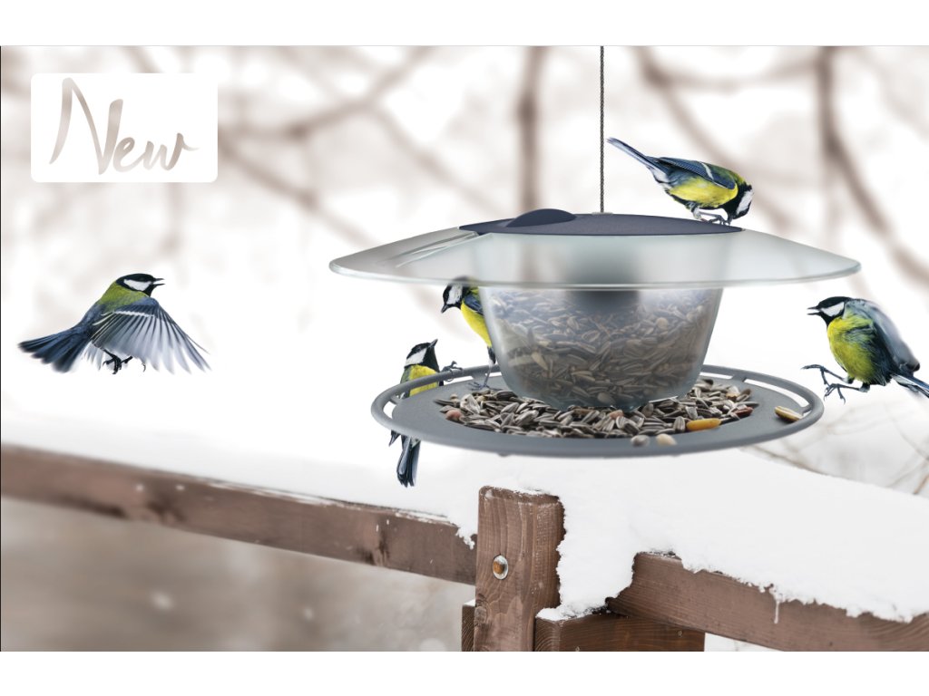 Dvojkomorové záhradné kŕmidlo pre vtáčiky BIRDYFEED ROUND poskytuje v dlhých zimných mesiacoch miesto, kde sa môžu bezpečne a v pokoji nakŕmiť.
