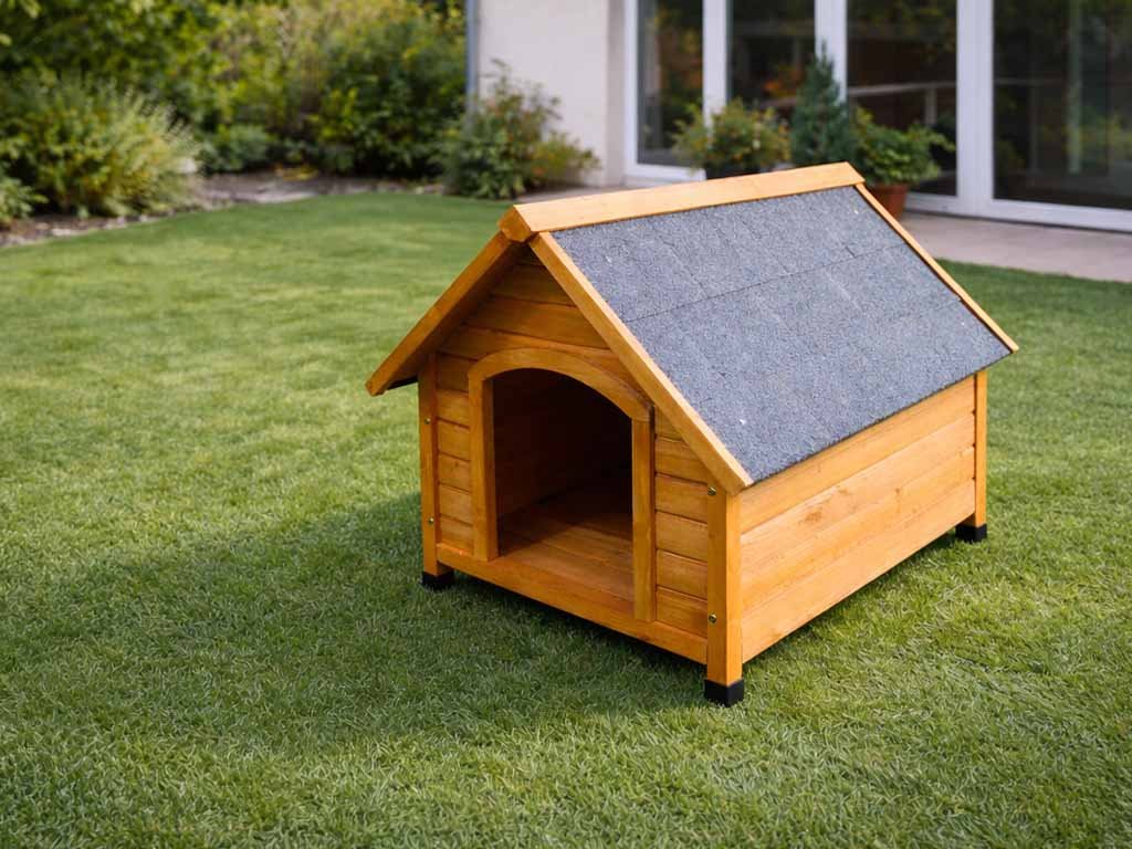 - Klasszikus fa kutyaház felnyitható tetővel és fémrudakkal.