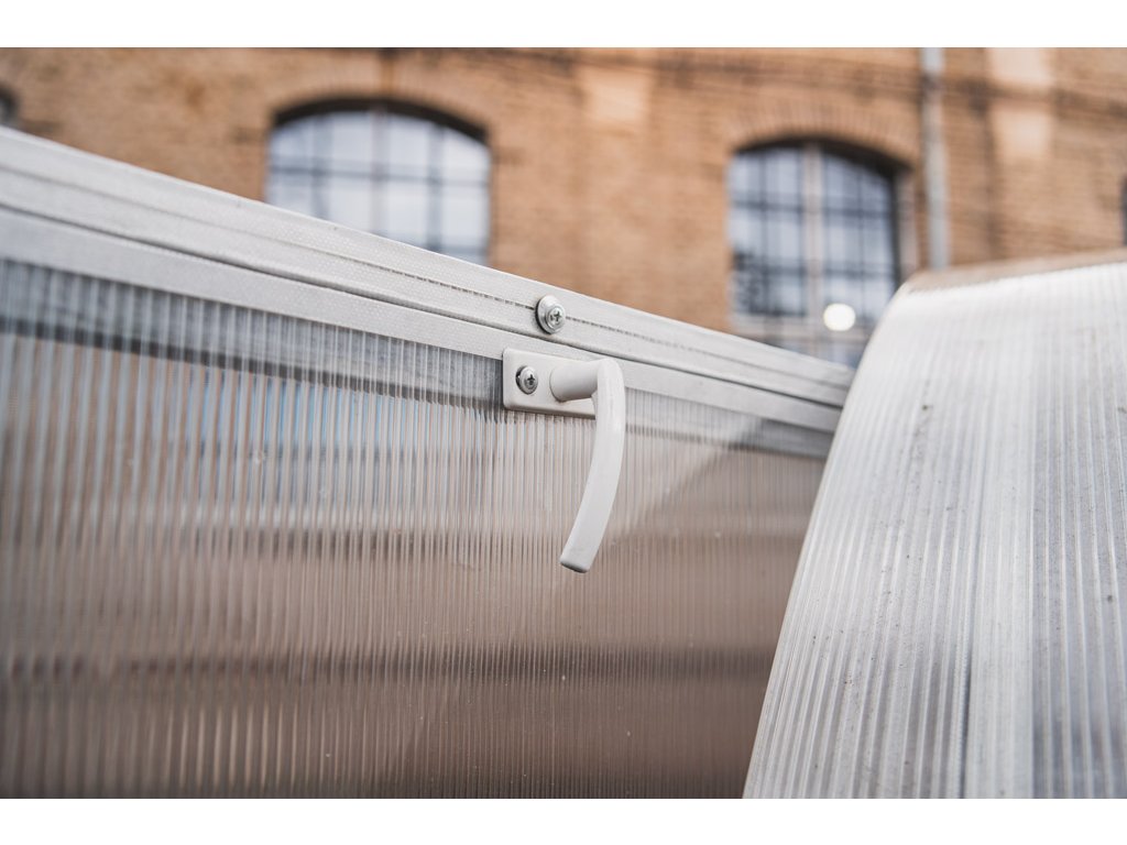 Az üvegház üvegezése átlátszó, üreges (kamrás) polikarbonátból készül, 4 mm vastagságban. Az UV-védelemnek köszönhetően nem töredezik meg és nem sárgul. A polikarbonát tanusítottan nem káros az egészségre.
