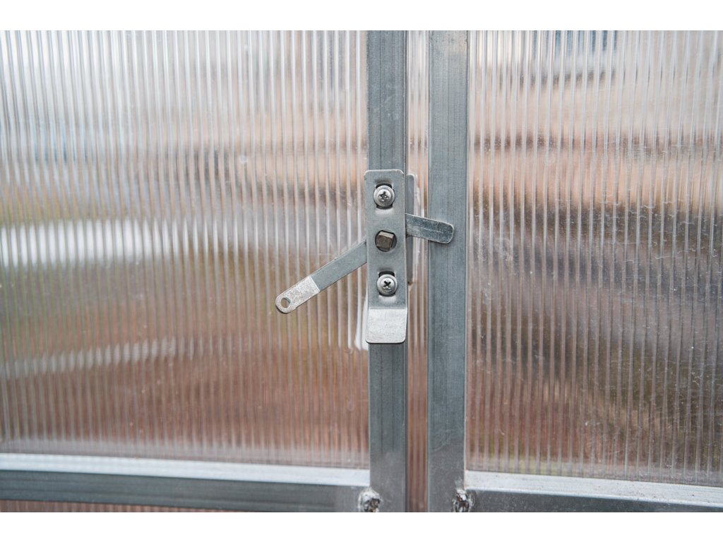Az üvegház üvegezése átlátszó, üreges (kamrás) polikarbonátból készül, 6 mm vastagságban. Az UV-védelemnek köszönhetően nem töredezik meg és nem sárgul. A polikarbonát tanusítottan nem káros az egészségre.