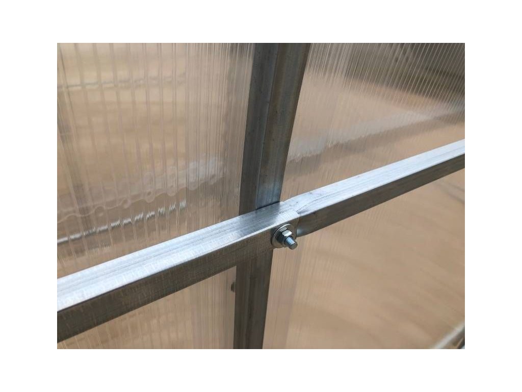 Az LEGI TOMATO 4 x 2 m-es polikarbonát íves üvegház extra robusztus tűzihorganyzott acélcsövekből (joklek) 20 x 20 mm. A horganyzott felület megvédi az üvegház vázát a korróziótól. A profil kívül-belül horganyzott. A hegesztett kötéseket cinkbevonattal kezelik. Ezeknek a paramétereknek köszönhetően az üvegház kiemelkedik tartósságában és robusztusságában. Terhelhetőség (hó, stb.) 80 kg/m2-ig - alsó és középső (kevésbé szeles) területekre alkalmas.