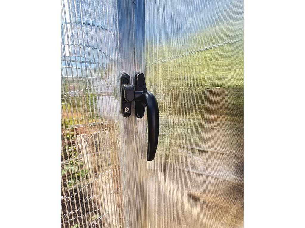 Az üvegház üvegezése átlátszó, üreges (kamrás) polikarbonátból készül, 4 mm vastagságban. Az UV-védelemnek köszönhetően nem töredezik meg és nem sárgul. A polikarbonát tanusítottan nem káros az egészségre.