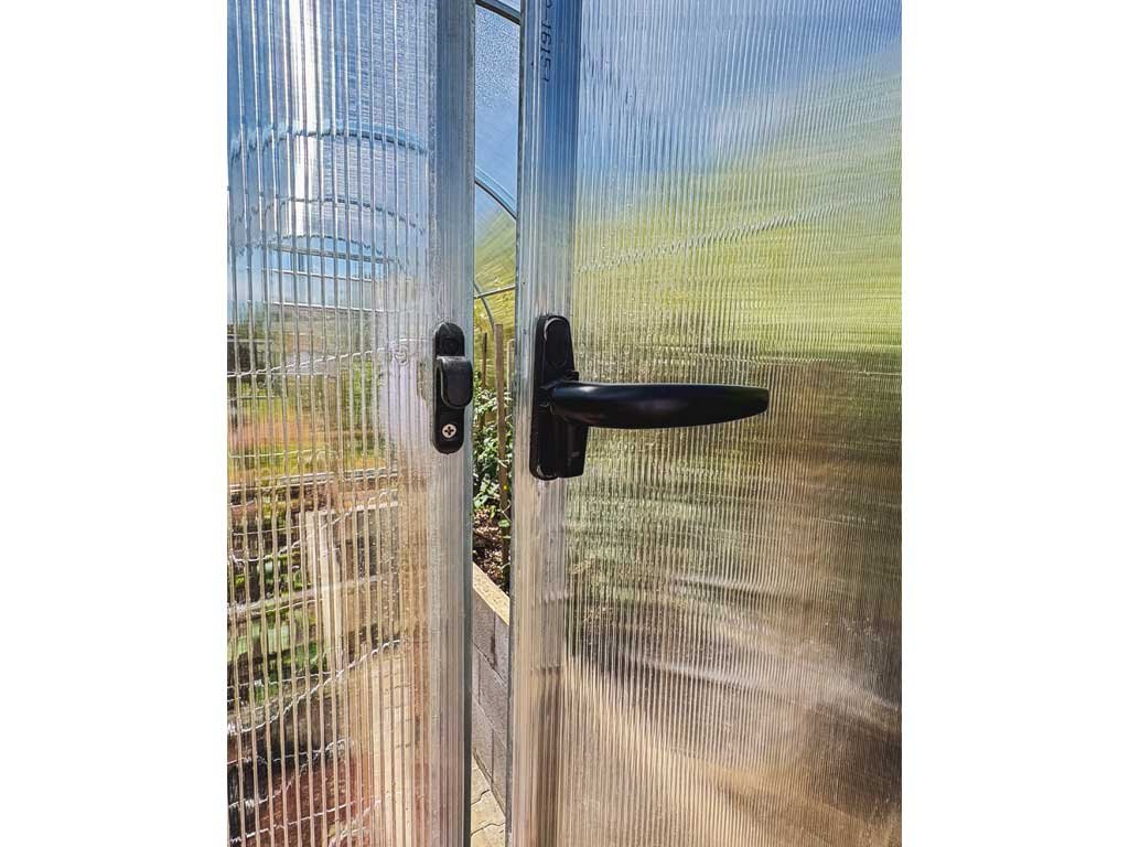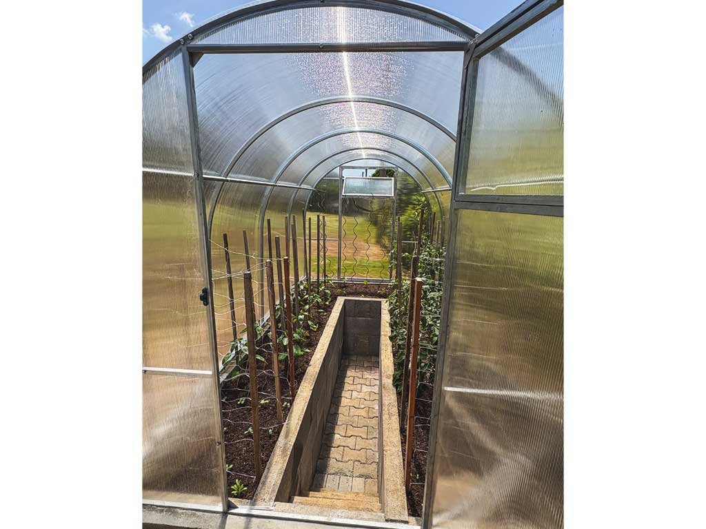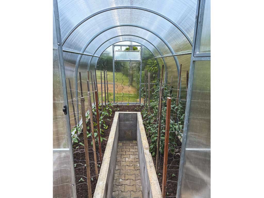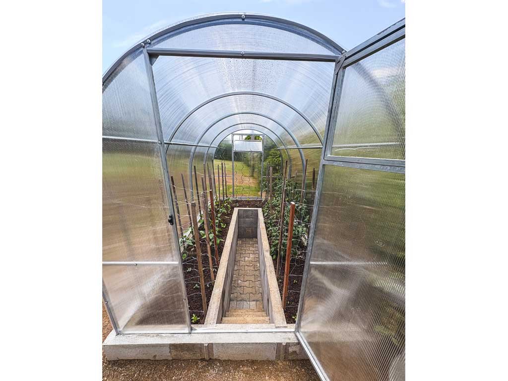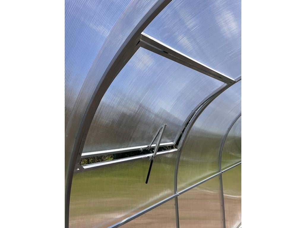 Az üvegház üvegezése átlátszó, üreges (kamrás) polikarbonátból készül, 6 mm vastagságban. Az UV-védelemnek köszönhetően nem töredezik meg és nem sárgul. A polikarbonát tanusítottan nem káros az egészségre.