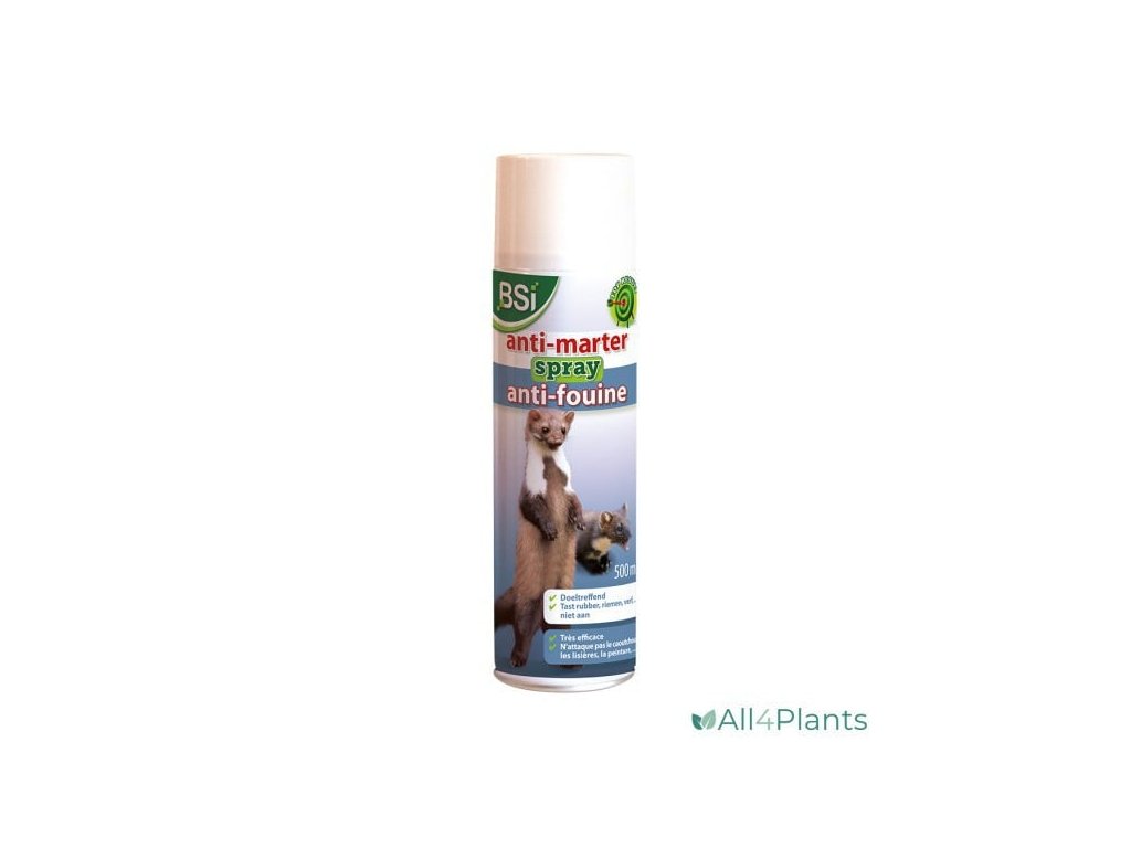 BSI Anti Marten Spray 500 ml megvédi a házakat és a járműveket a nyestektől. Ez egy gyors hatású spray, amely elriasztja a nyesteket. Használja azokon a helyeken, ahol a nyestek kárt okozhatnak, például szigetelőanyagokon, elektromos vezetékeken vagy csöveken. Az alkalmazást ismételje meg minden egy-három napban, hogy végleg elűzze a nyesteket.