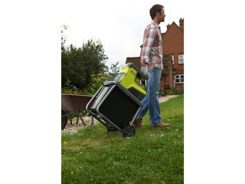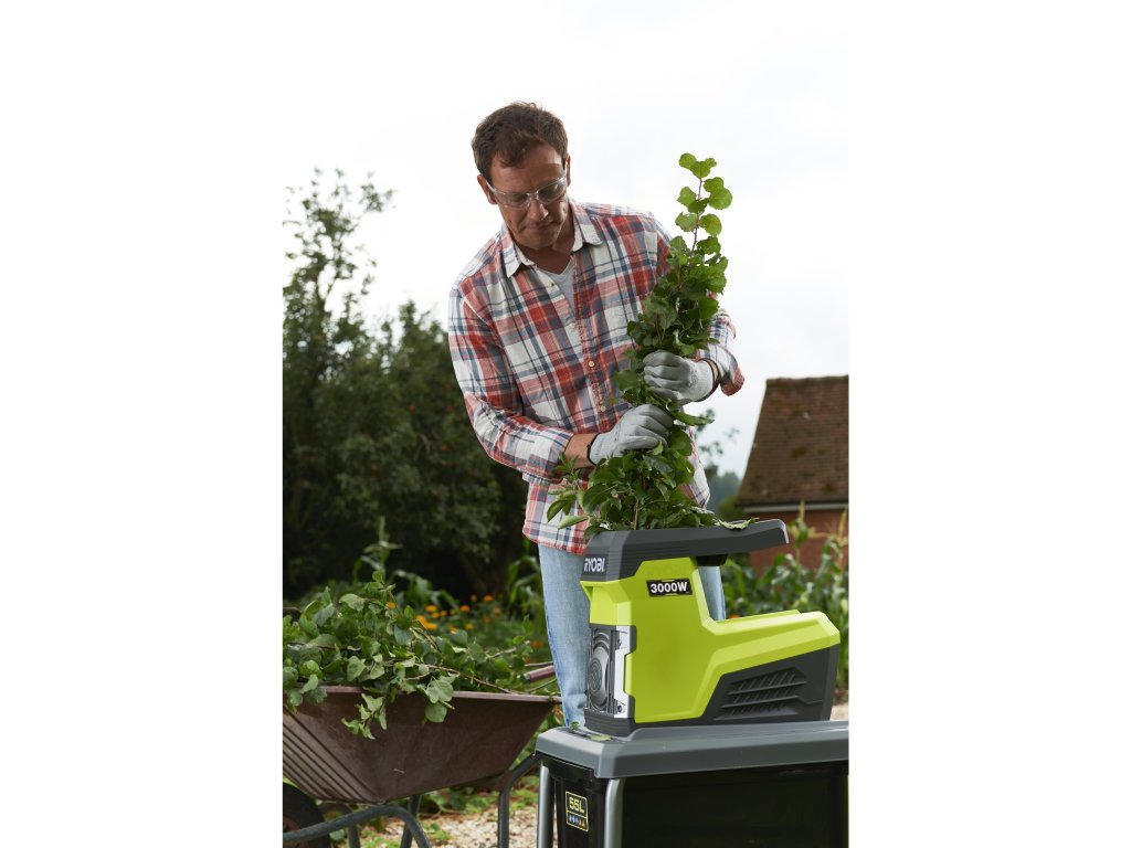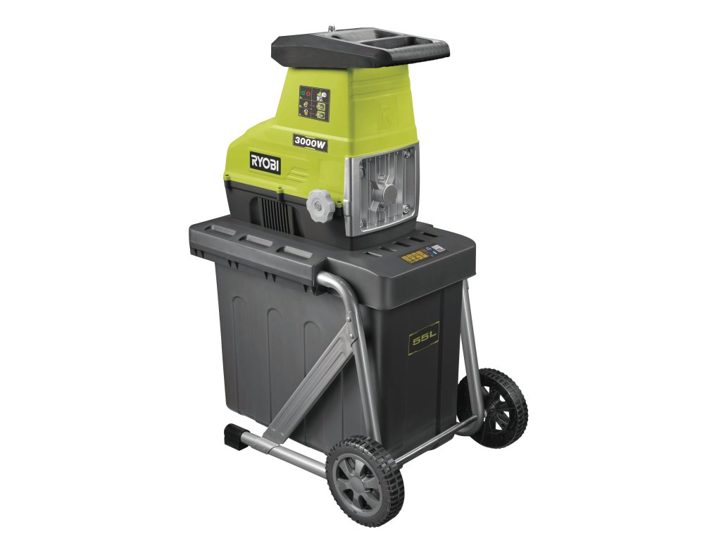 A RYOBI 3000 W csendes elektromos hengeres ágaprító 55 literes tartállyal egy nagy teljesítményű, kompakt gép, amelyet tüzelőanyagként, talajtakaró vagy komposzt anyagként való ágak feldolgozására használnak.