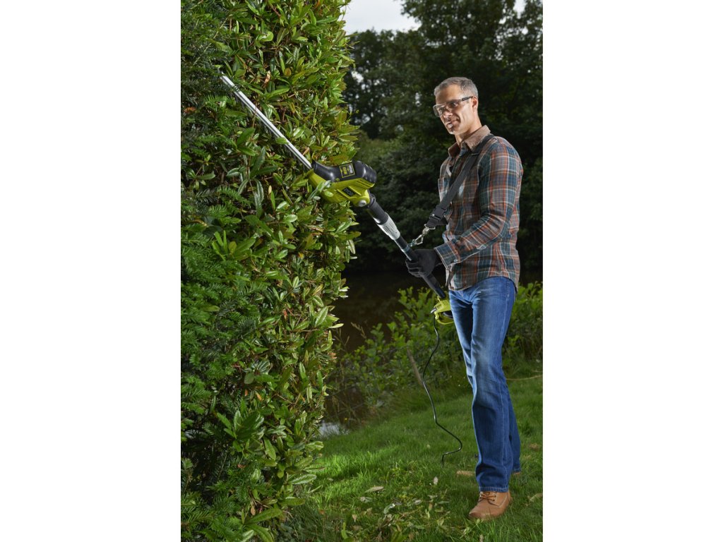 Teleszkópos elektromos sövényvágó RYOBI RPT4545E, 450 W forgatható fogantyúval ideális segítőtárs sövények, díszfák és bokrok ápolásához, amely segít megőrizni sövényét szép és egészséges állapotban, létrahasználat nélkül is magas sövények nyírása közben.