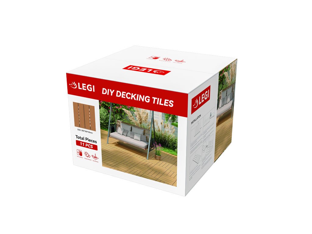 A teak színű LEGI Base WPC burkolólapok a LEGI komplex padlórendszerének részei, és kültéri padlóburkolatként ajánlottak. Nagyon egyszerűen és gyorsan szerelhetők és szétszerelhetők. A Base burkolólap mérete 2,0 x 30 x 30 cm.